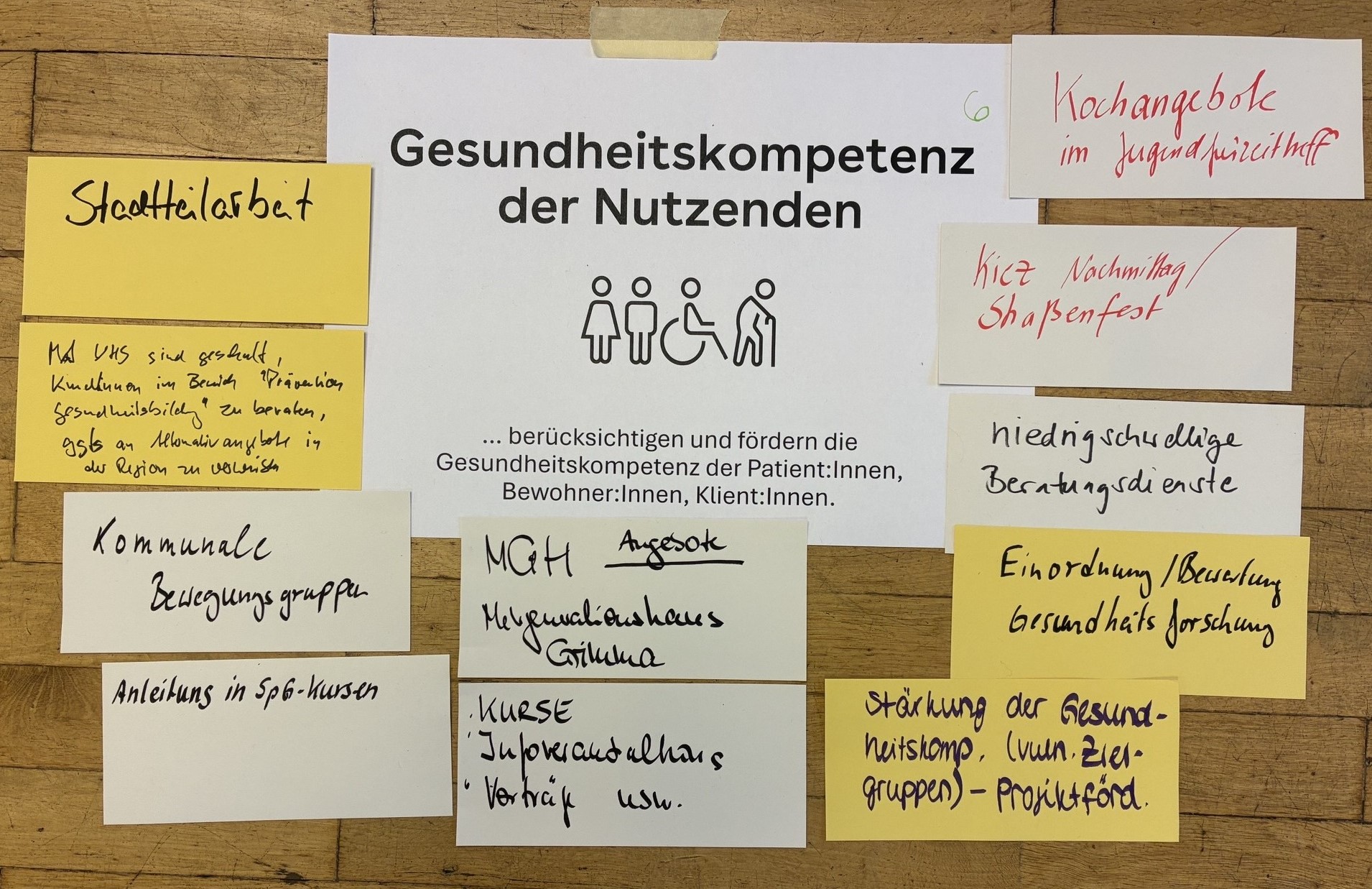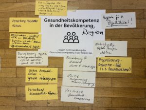 Folgende verdichtete Ansätze markierten für die Teilnehmenden die Perspektive: schaffen eines gemeinsamen Verständnisses zu Gesundheitskompetenz und gesundheitskompetente Einrichtungen, das Ineinandergreifen von Prozessen monitoren und – dort, wo möglich – gestalten, über Budget und Ressourcen verfügen.